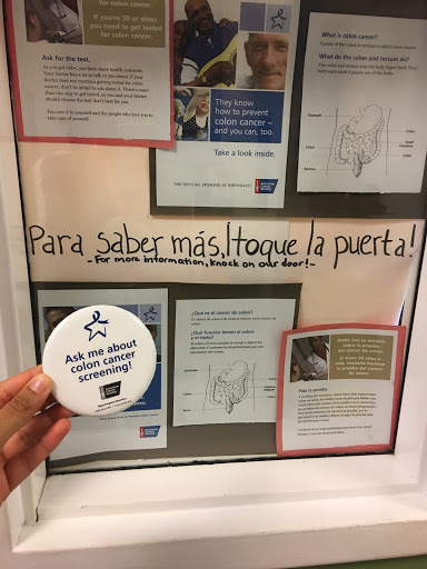 [Image Description: NHC Member holds a button that says, “Ask me about colon cancer screening!” in front of a sign that explains colorectal screenings in Spanish and English. In Spanish, a note reads: “Para saber mas, toque la puerta!” which translates to “To learn more, knock on the door!”]