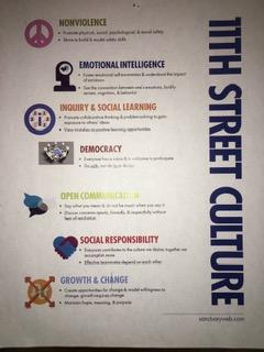 [Image Description: Above is an image of a flyer showing different aspects of trauma-informed care that are valued by 11th Street, including growth and change, social responsibility, open communication, democracy, inquiry and social learning, emotional intelligence, and nonviolence.]