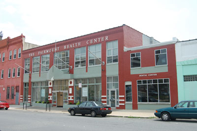 [Image description: Picture taken from outside that shows Fairmount Primary Care Center, a red building covered in glass panels.]